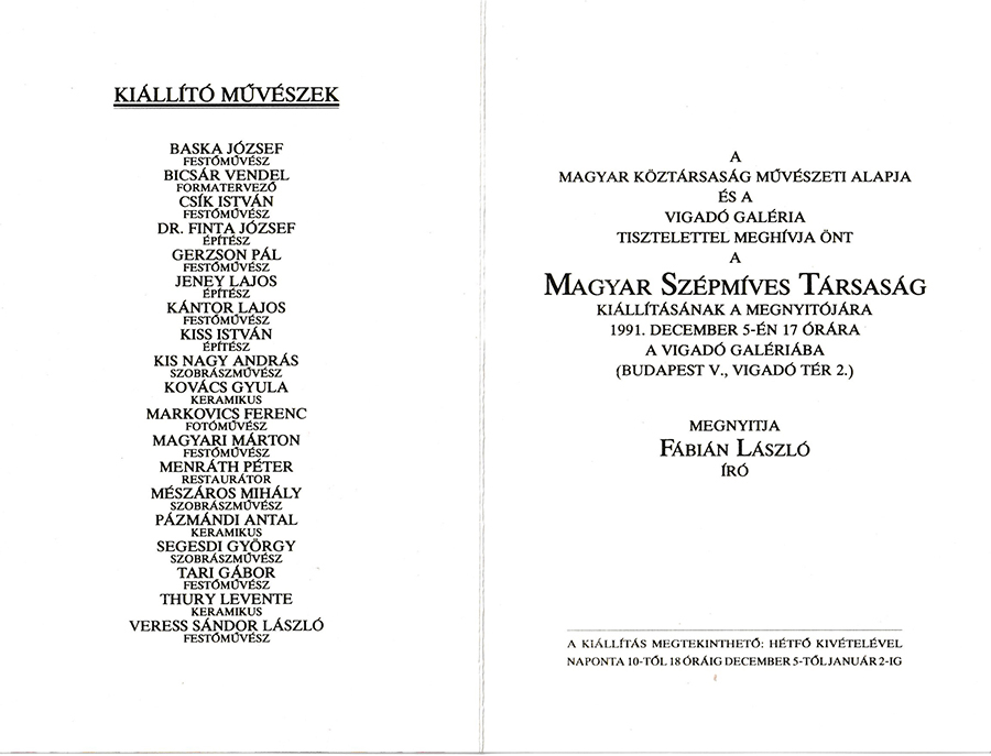 A Szépmíves Társaság kiállításának meghívója 1991